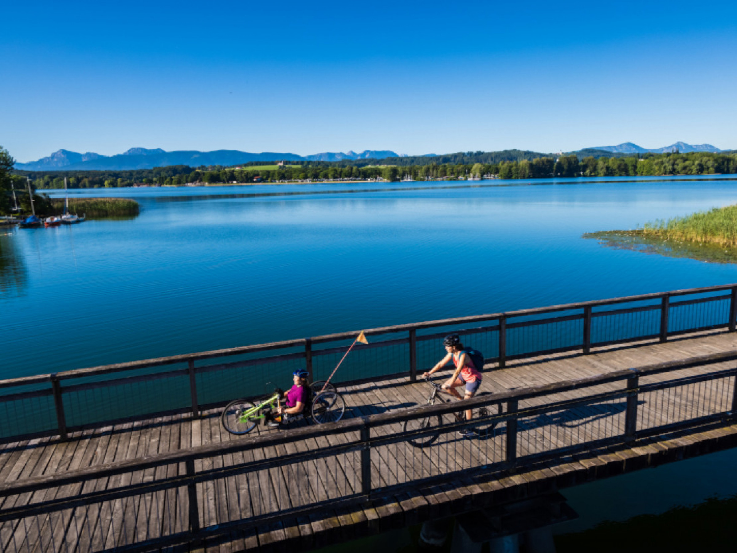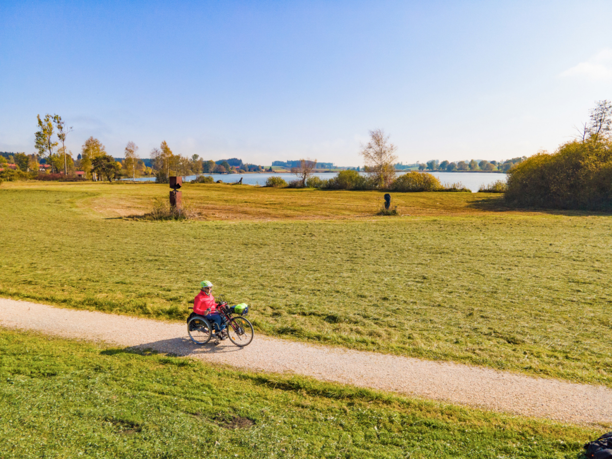 Eine besonders schöne, entspannte Tour führt rund um den Obinger See nördlich des Chiemsees. Auf der rund 45-minütigen Umrundung begleiten den Weg rund 20 Skulpturen verschiedener Künstler. Auch die malerische Gegend zwischen Waginger See, Tittmoning und der Salzach an der deutsch-österreichischen Grenze lässt sich wunderbar mit dem Handbike erkunden. Unterwegs laden Badeplätze, Panoramablicke und traditionsreiche Wirtshäuser zum Verweilen ein. Alle Touren wurden gemeinsam mit erfahrenen Handbikern entwickelt, mehrfach getestet und sind durchgehend beschildert.