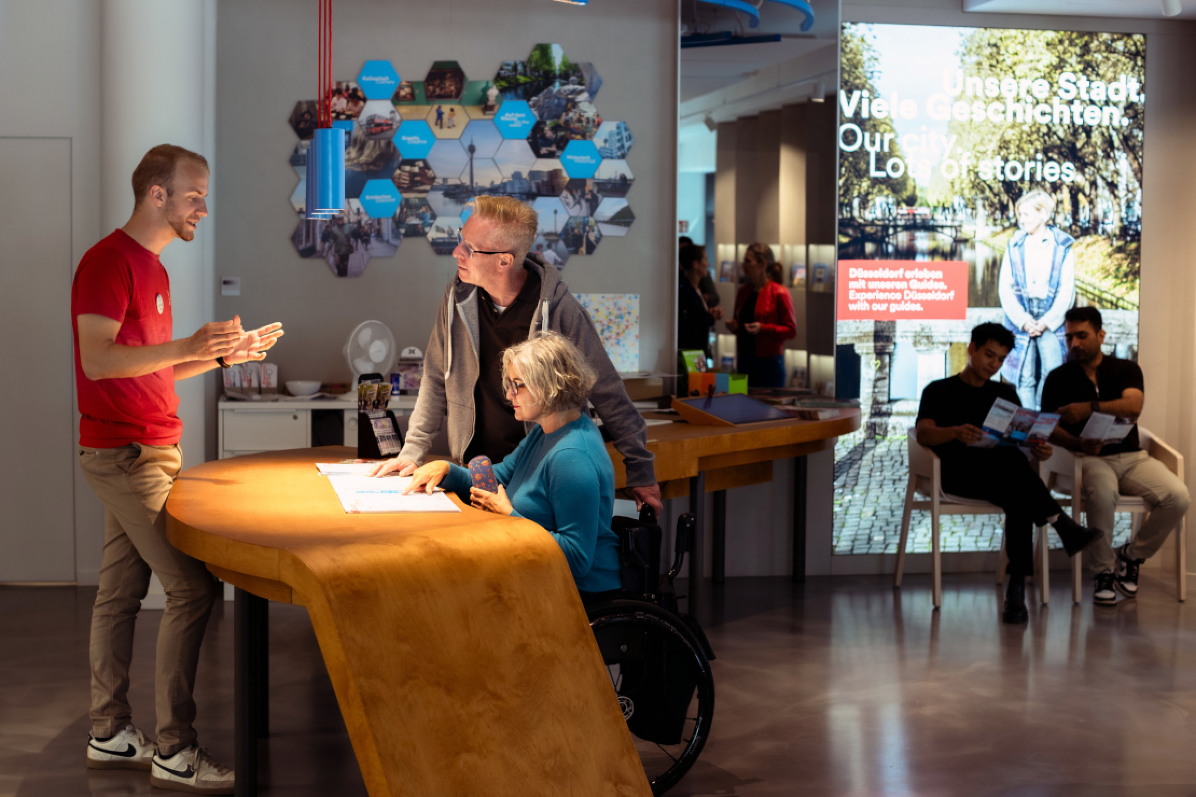Bei Stadtführungen, die nach Reisen für Alle zertifiziert sind, können Gäste tiefer in die Geschichten von Düsseldorf eintauchen: Sie lernen zum Beispiel die historische Altstadt oder den modernen MedienHafen kennen. Für Eilige bietet sich die Tour „Düsseldorf Kompakt“ an: In 60 Minuten geht es einmal durch die Altstadt, an den Rhein und zur berühmten Königsallee. Bei speziell für Gäste mit Behinderung konzipierten Touren gehen die Guides auf individuelle Bedürfnisse ein. Wer lieber selbst unterwegs ist, findet einen 60-Minuten-Rundgang in Gebärdensprache auf dem YouTube Kanal von Visit Düsseldorf.