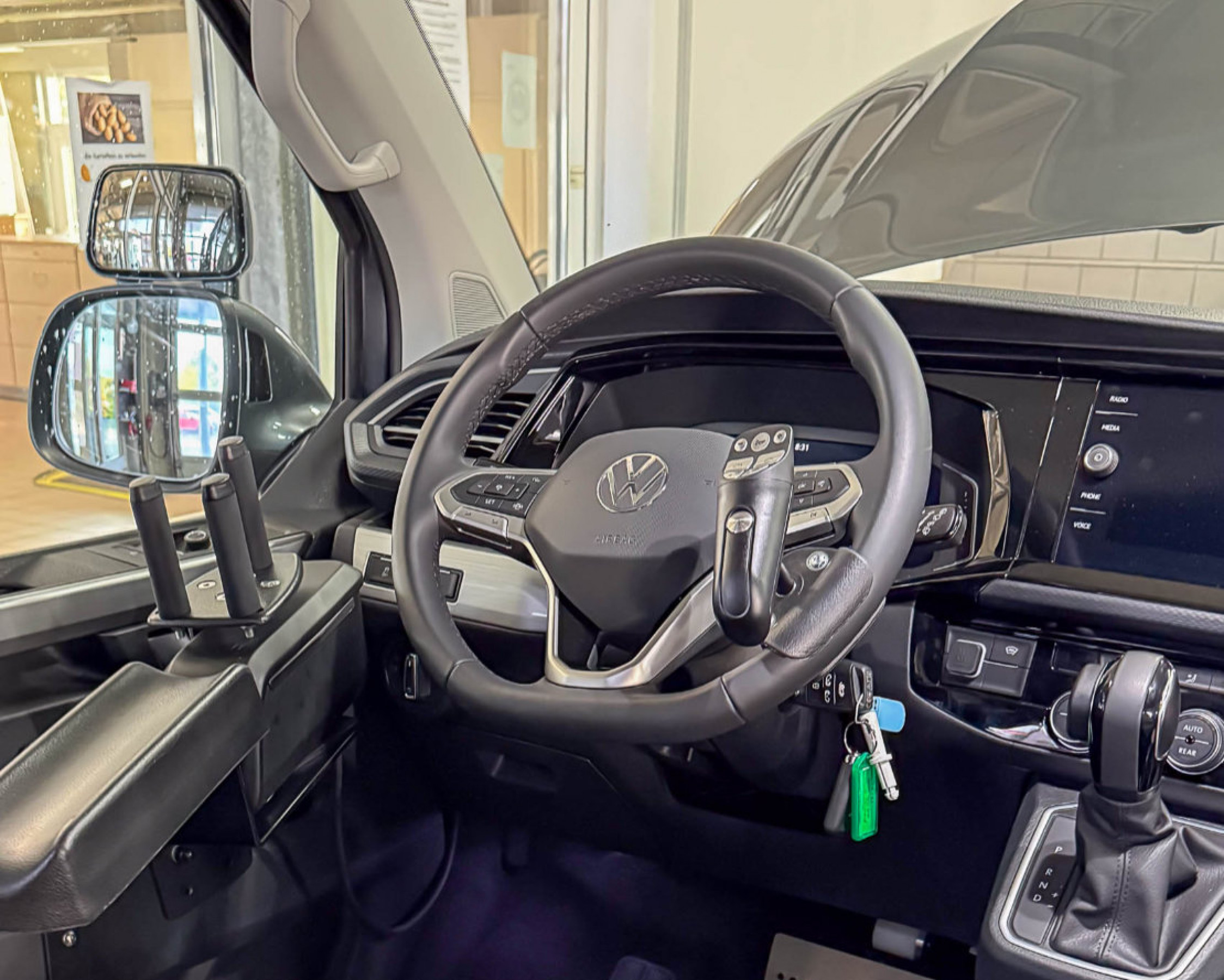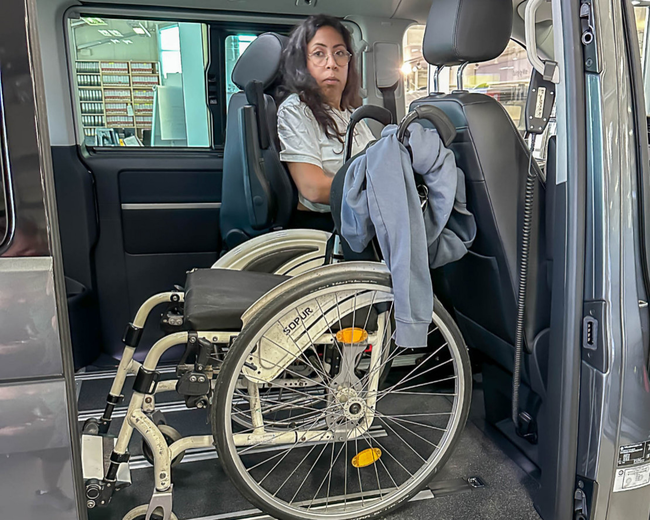 Die Wahl fiel schließlich auf einen VW T6.1, der im PARAVAN Mobilitätspark in Aichelau ganz individuell an Sabinas Bedürfnisse angepasst wurde. Mit an Bord ist das digitale Fahrsystem Space Drive, das Sabina über einen Gas-Bremsschieber mit der rechten Hand bedient. Eine leichte Lenkung mit Handknauf ermöglicht eine präzise Steuerung, während der PARAVAN-Kassettenlift den barrierefreien Einstieg sichert. Mithilfe der PARAVAN-Transferkonsole kann Sabina sich direkt vom Rollstuhl auf den Originalfahrersitz setzen – und ist startklar. Auf ein Touchsystem bzw. eine Sprachsteuerung hatte sie bewusst verzichtet. „Das hatte mich in der Fahrschule etwas irritiert“, berichtet Sabina. „Damals war es die beste Lösung – mal sehen, ob es so bleibt.“