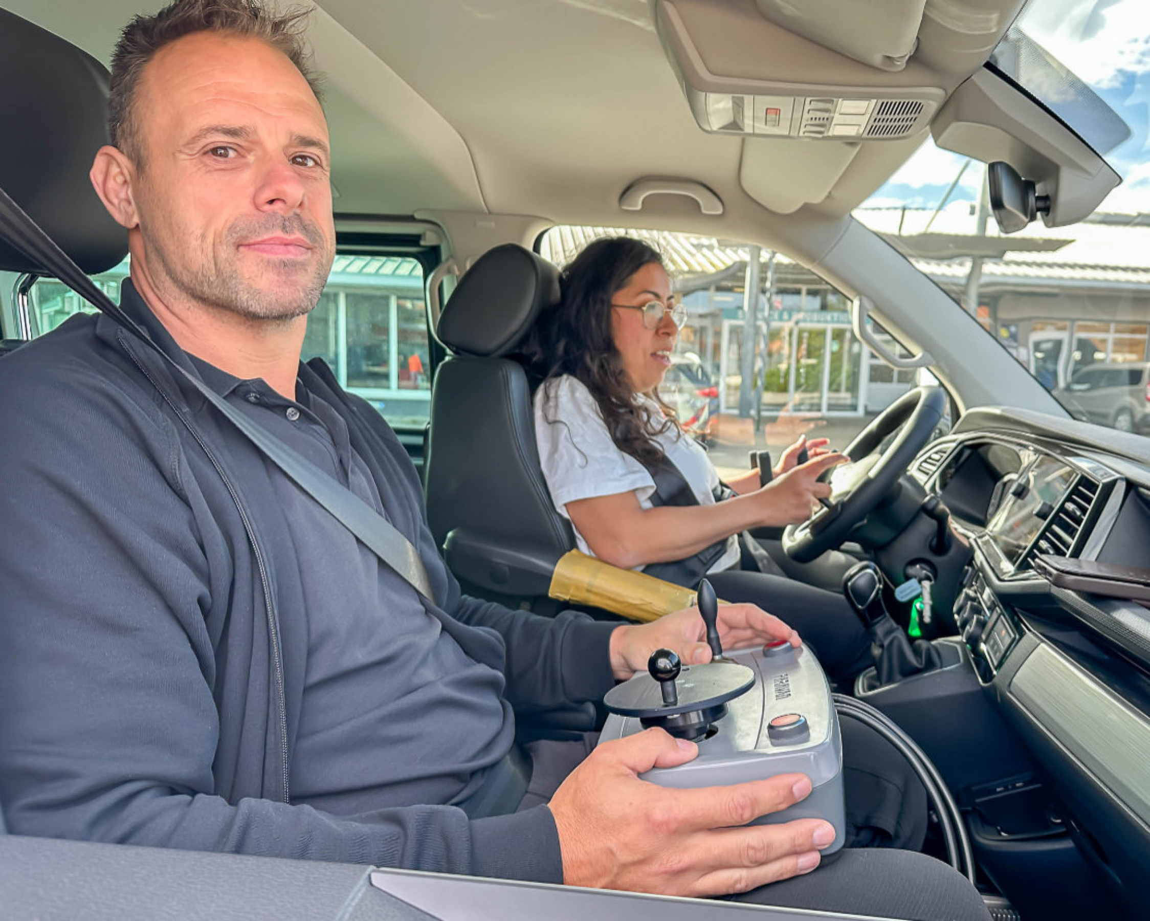 Wie war die erste Fahrt bei der Anpassung? Emotional. „Als ich das Auto gesehen habe, kamen mir die Tränen“, erinnert sie sich. PARAVAN-Fahrlehrer Ralf Buhmann, der sie schon durch die Ausbildung begleitet hatte, war bei der ersten Testrunde nach vier Jahren wieder an ihrer Seite. „Du musst mir dann sagen, ob es so passt und wir es jetzt fixieren können“, sagt er mit Blick auf die korrekte Position der rechten Armlehne.
